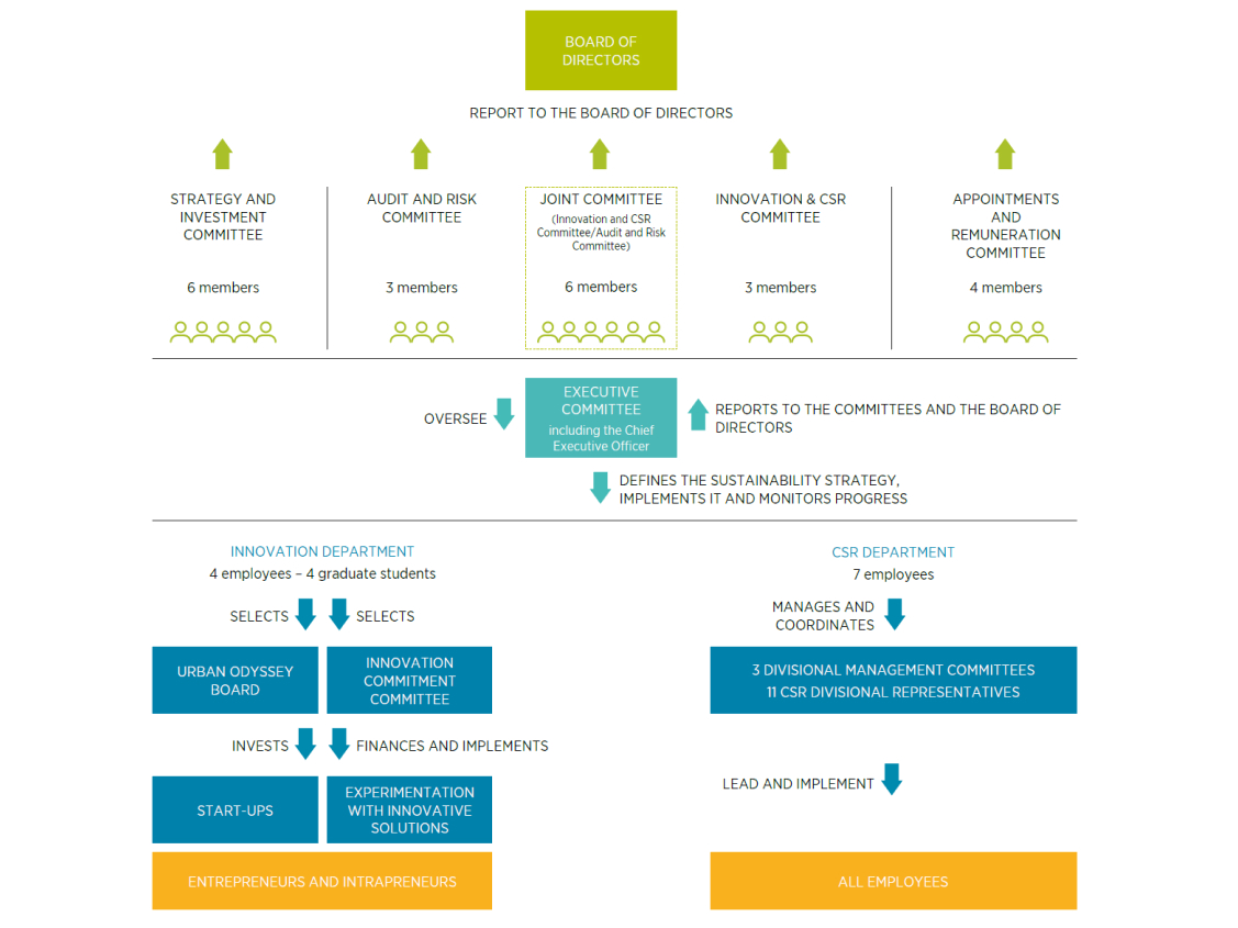 • The Joint Committee, made up of the Innovation and CSR Committee and the Audit and Risks Committee, oversees certain tasks relating to sustainability reporting. Its remit includes reviewing sustainability reporting, monitoring the implementation of policies and the achievement of related objectives, and examining issues relating to the sustainability auditor.