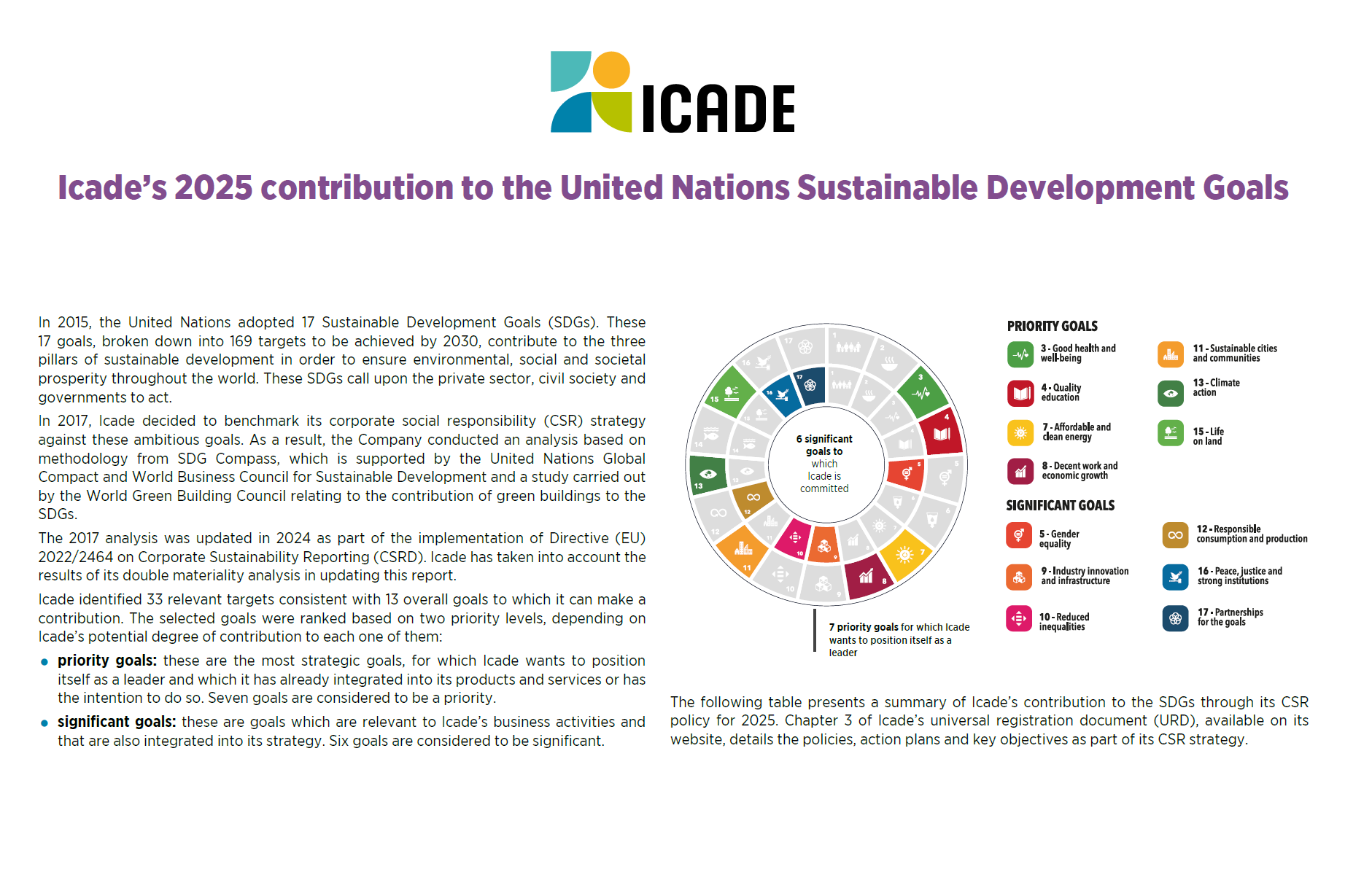 La priorisation des enjeux RSE s'est appuyée entre autres sur l'analyse des 17 objectifs de développement durable de l'ONU. Nous avons défini sept objectifs prioritaires pour lesquels nous souhaitons nous positionner comme leader et six significatifs, pour lesquels nous nous impliquons fortement.