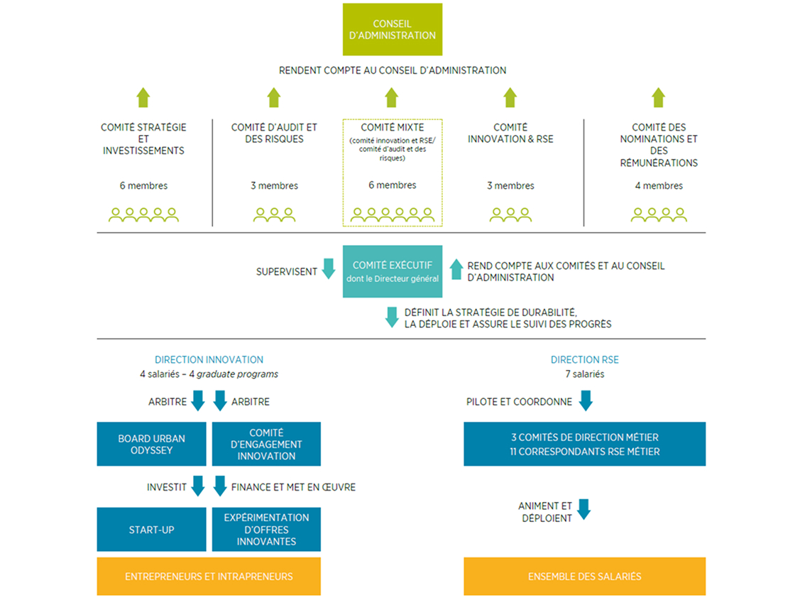 Pour mener à bien notre politique RSE, nos organes de gouvernance veillent, chacun à leur niveau et selon leurs rôles et responsabilités, à ce que l'ensemble de nos activités prennent en considération les enjeux sociaux, environnementaux et de conduite des affaires.
